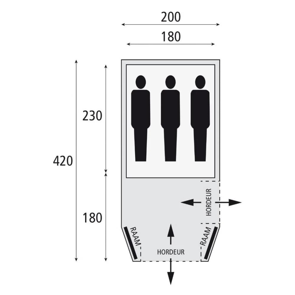 Deze 3-persoonstent van Bardani heeft één slaapcabine. Zowel de opening van de slaapcabine als de opening van de leefruimte hebben horrengaas om goed te kunnen ventileren en om vervelende insecten buiten de tent te houden. Het tentdoek is gemaakt van katoenpolyester en heeft een goed ademend vermogen. Al deze eigenschappen zorgen voor een aangenaam klimaat in de tent. Het compacte formaat en het snelle opzetten maken deze tent zeer geschikt als bijzettent.