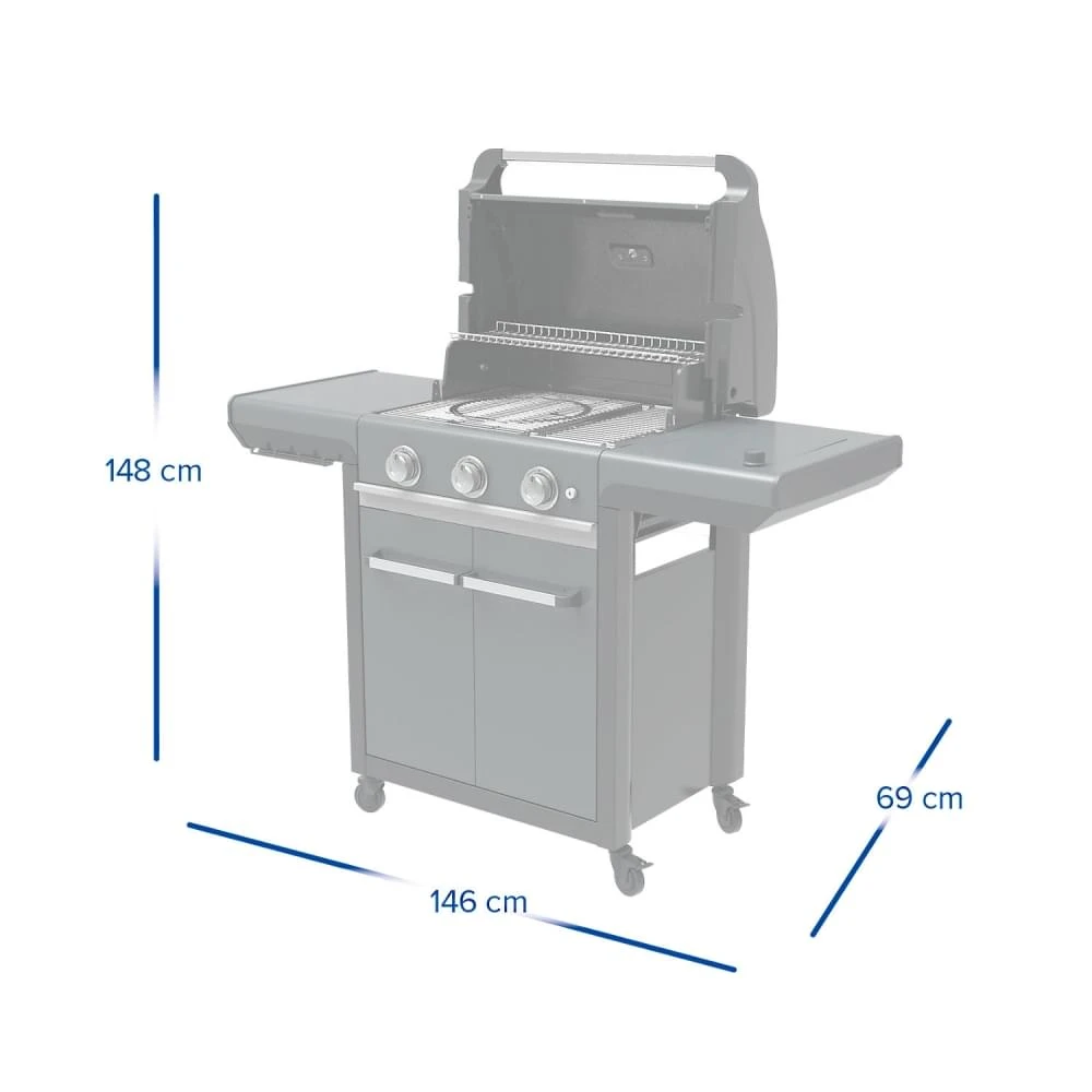 De perfecte barbecue voor het houden van een feestje voor familie en vrienden. De 3 series Premium S gasbarbecue van Campingaz is voorzien van krachtige rvs-branders met het efficiënte Blue Flame Power System. Dit systeem zorgt voor aanzienlijk minder vlammen waardoor het vlees sappig en smaakvol blijft. Daarnaast kan je de bbq gemakkelijk ontsteken door de elektrische piëzo. Het kookoppervlak heeft een grootte van wel 2806 cm² en het rooster is gemaakt van geëmailleerd gietijzer. De zijtafel is voorzien van een brander voor het opwarmen van bijvoorbeeld de pindasaus. De andere zijtafel kan opgeklapt worden zodat de barbecue minder ruimte inneemt wanneer je deze niet gebruikt en de barbecue is ook gemakkelijk te verplaatsen door de vier afzonderlijk bestuurbare wieltjes. Deze buitenkeuken is ook voorzien van twee deurtjes voor het gemakkelijk opbergen van je gasfles.