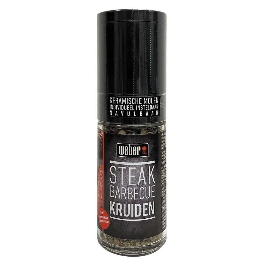Steak BBQ kruidenĀ van Weber in een handige kruidenmolen.Ā De keramische kruidenmolen is instelbaar en navulbaar.